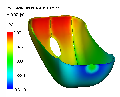 The volumetric shrinkage for this material is best when between 1% and 3%. The end of fill is a little high, and the area near the gate is negative which means significant over packing.