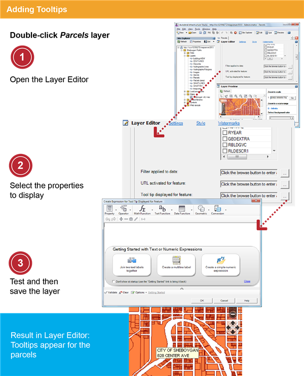 In this exercise, you select properties to display in Tooltips. Tooltips are pop-up boxes that contain information about the features in the map. You will be able to view the tooltips in the Web browser in the final exercise.