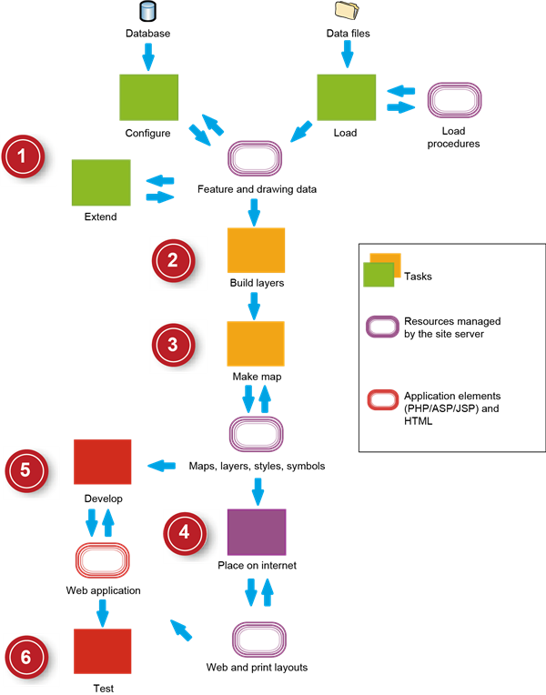 The diagram on the facing page shows the process of developing a Web-based application using Infrastructure Map Server. In the diagram, the rectangles represent tasks, the oval shapes represent entities that are created by the tasks or used by them, and the arrows indicate the flow of data. You can break down the development process into five phases (you may also have a Planning and Preparation phase, not included in this diagram):