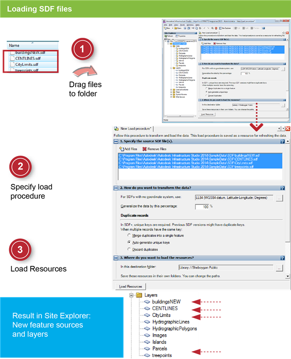 In this exercise, you add more data source files to the site. Like SHP files, you load SDF or SQLite files by dragging them directly into a folder in the Site Explorer.