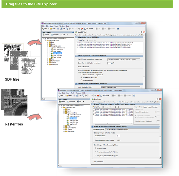 The illustration shows two load procedures open in Infrastructure Studio. Both procedures load multiple files at the same time. One loads SDF files, and the other loads raster files.