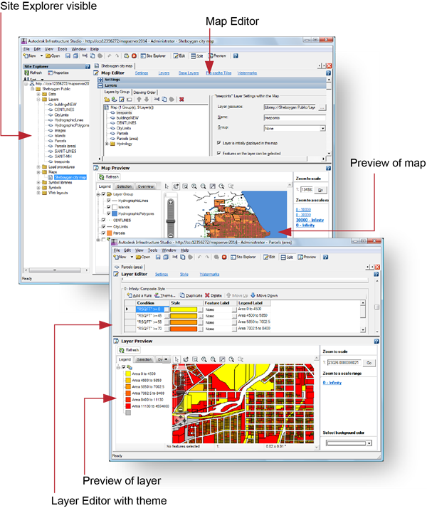 When you open Infrastructure Studio and connect to your site server (via the WebAgent), the Site Explorer shows you the resources stored in the resource repository, as shown in the upper image. Double-clicking any resource in the Site Explorer opens the appropriate editor for that resource. If the resource is a layer or a map, the viewer also opens and displays a preview of the data.