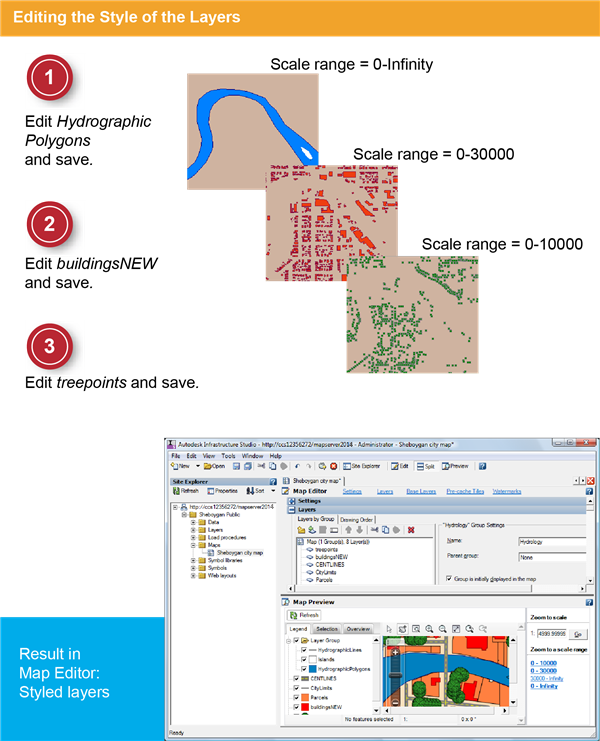 In this exercise, you provide styles for some of the layers that have not yet been edited, so that the layers in the map are displayed in color and at the appropriate scales.