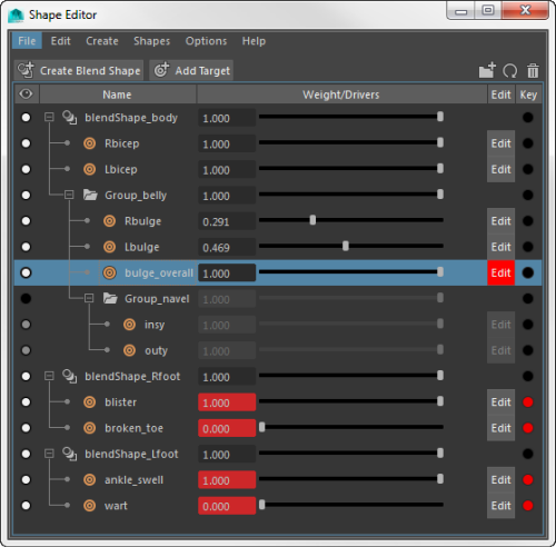The new Shape Editor replaces the Blend Shape Editor as the place to create, edit, and manage shapes. New features include soloing, grouping, mirroring, flipping, duplicating, and importing and exporting shapes.