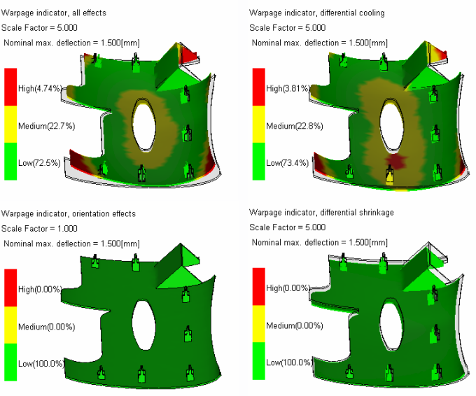 This result shows the relative magnitude of the warpage (out of plane change in shape) for the parts. Green areas are less than 80% and red areas are at least 120% of the Nominal max. deflection. The default value for Nominal maximum deflection is half the average wall thickness of the part. This result is shown in the result legend and is also listed in the Warpage Constraints