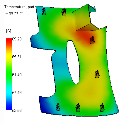 In this case, the target temperature is 50 C. The variation in temperature max to min is under 20C which is good. However even the coolest temperature on the part is higher than the target indicating the coolant temperature, in this case 25C is too high.
