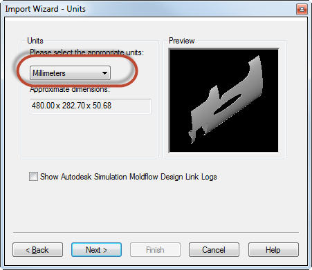 The next two steps will only occur when importing for the first time you have imported a model after installation. You are asked to update the location of Autodesk Simulation Moldflow Design Link. After your first time importing, you can start on step four.