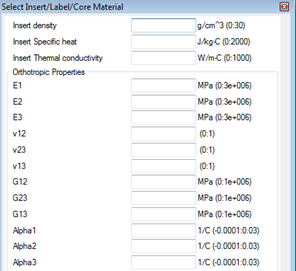 Important: The material data listed above is entered with specific first and second principal axes. The data must be entered , with relevant positioning information, for every element of the part insert.