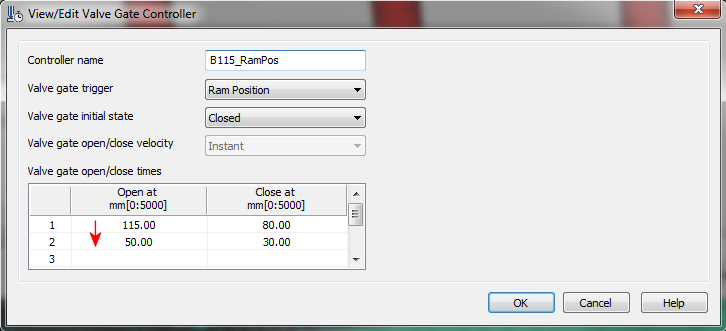 You can select to trigger the valve gate by ram position, either when creating a new valve gate controller, or by editing an existing valve gate controller.