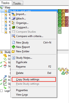 2. Select the original study, click the right-hand mouse button and select Copy Study settings from the context menu. Notice that the Paste Study settings option, below it, is not active at this stage.