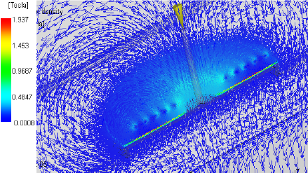 Figure 1 shows an example of this vector plot, with the colour showing the strength of the magnetic field, and the vector direction showing the direction in which the magnetic fields in the mold interact with each other. In some cases the magnetic fields in certain regions in the mold can cancel each other out, resulting in very little Joule heating in these regions. The strength of the magnetic field can also be compromised by the material chosen for the inserts. If this is the case, it can be seen in this plot.