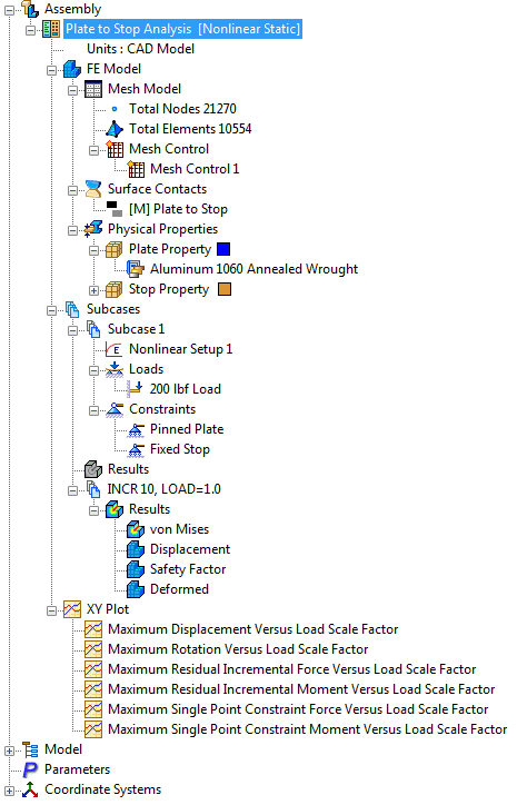 Load and Display Intermediate Results: This option works in conjunction with Generate Intermediate Results and thus, is only available when that option is checked. The incremental results are automatically loaded into the tree under Subcases and can be viewed until the next increment has been solved. This is shown in the example below.