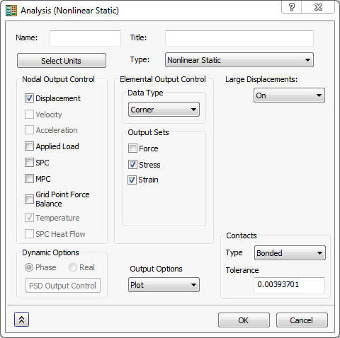 Dynamic Options: Contains Phase and Real radio buttons. These buttons only appear when the analysis type is set to a Frequency and Random Response. It also contains PSD Output Control button which will appear when the analysis type is set to Random Response.