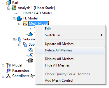 Delete All Meshes will delete the mesh on all the parts, after which Autodesk Nastran In-CAD automatically creates an empty Mesh Model.