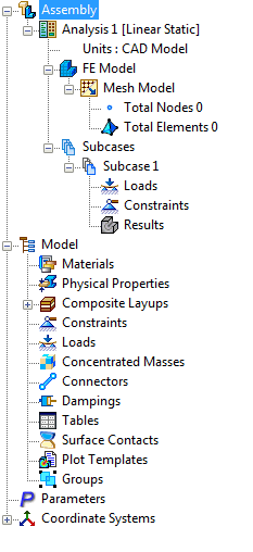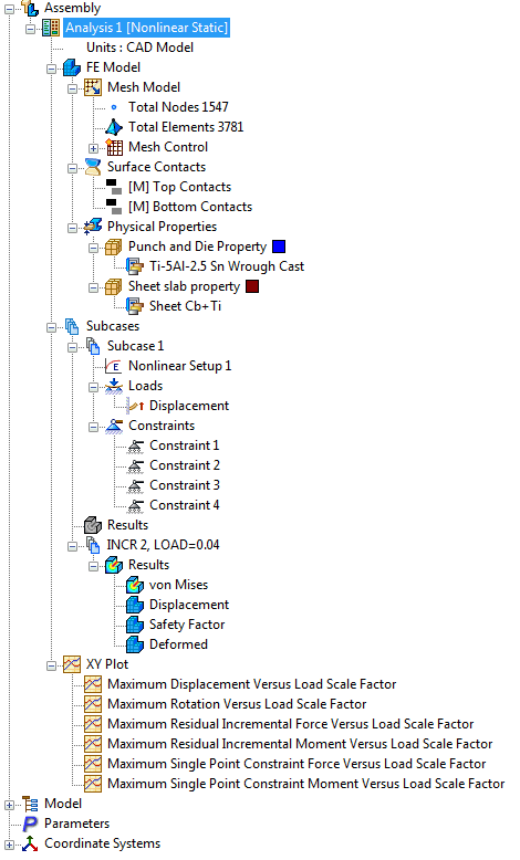 - Load and Display Intermediate Results: This option works in conjunction with Generate Intermediate Results and thus, is only available when that option is checked. The incremental results are automatically loaded into the tree under Subcases and can be viewed until the next increment has been solved. This is shown in the example below.