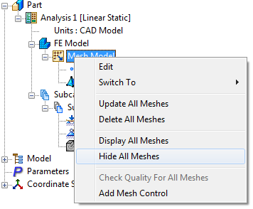 They can be easily accessed by clicking Show/Hide Mesh icon on the Mesh panel on the ribbon bar, or by right-clicking Mesh Model and selecting Display All Meshes and Hide All Meshes.
