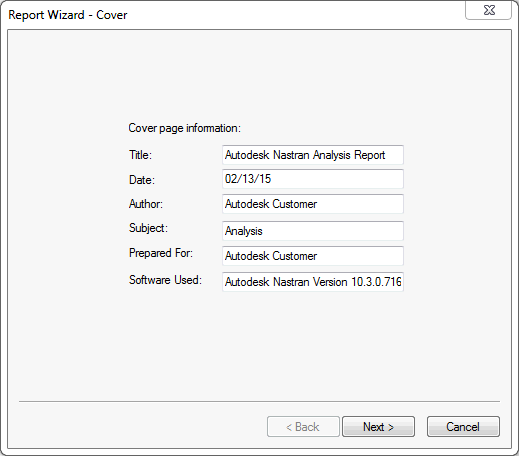 After right-clicking on Analysis and selecting Generate Report, the Report Wizard – Cover window opens. Fill in desired information and click Next >.