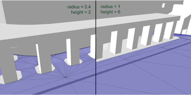 If you choose to share a single Database for multiple different types of characters, it is safest to generate the data using the radius and height of the largest character. This is readily apparent if you consider the case of the human and the giant: