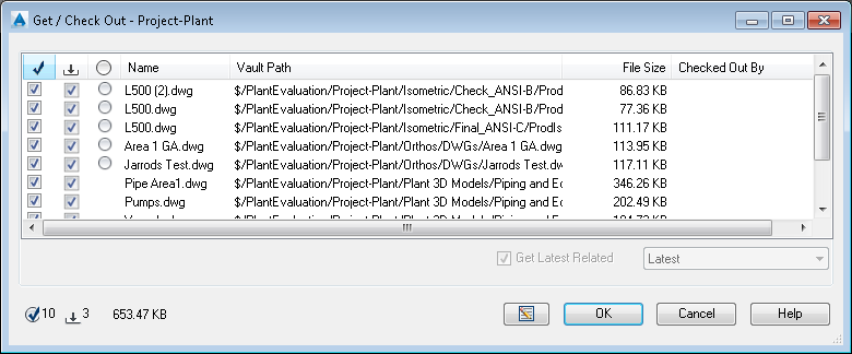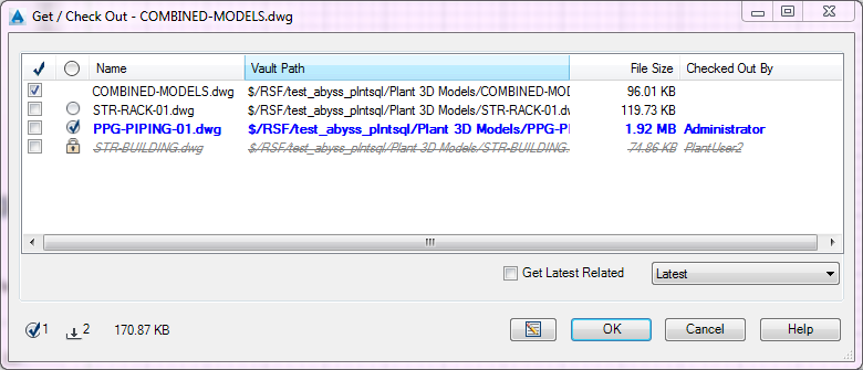 The new Get / Check Out dialog box also shows vault status. str-building above is checked-out by another user. ppg-piping-01 is already checked-out to you. And str-rack-01 is available for check-out.