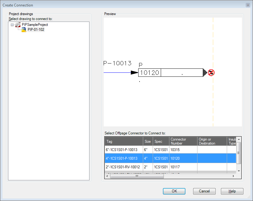 Displays a list of project drawings, from which you select a drawing that contains a complementary off-page connector. When you select a drawing, a list of available OPCs is displayed in the table with the top row selected and the line segment OPC displayed in the preview area.