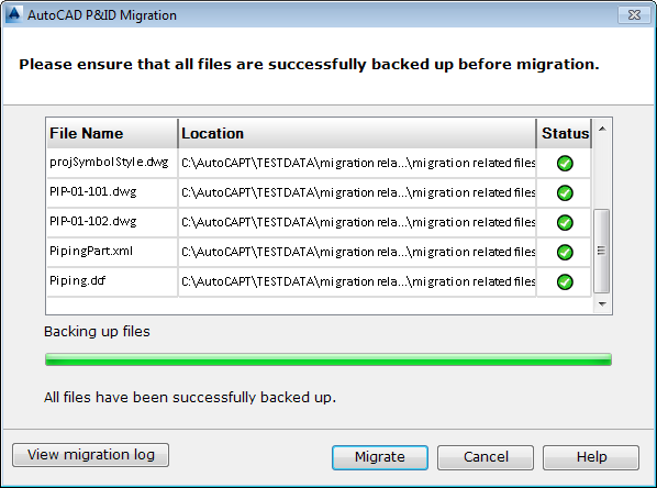 - Click Next. The Project Migration Backup page shows the progress of the backup and indicates whether it successfully backs up each file.