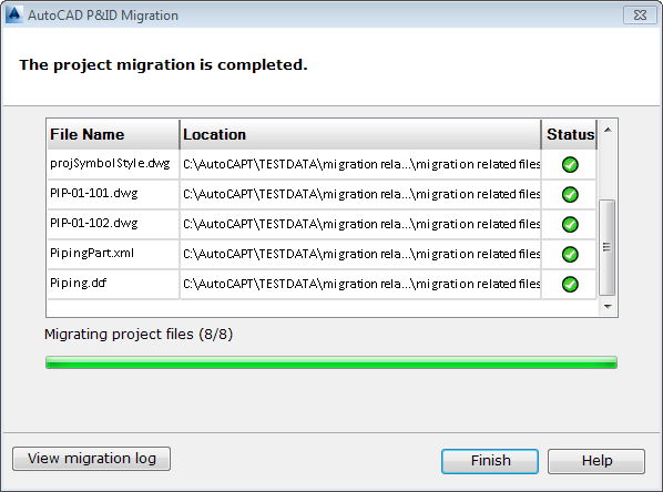 The migration process can be time-consuming, depending on the size of a project and the number of associated drawings. The Migration progress table reports successful or failed file migration and indicates the progress of the migration. Once all files successfully migrate, the project opens in AutoCAD P&ID 2015.