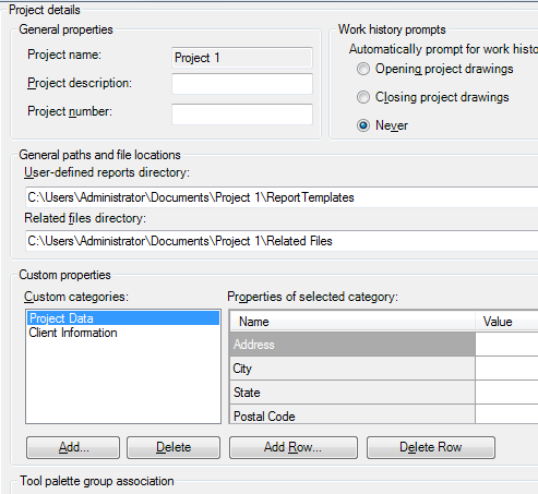 Other general project information includes paths, work history prompt settings, the Data Manager zoom settings, and the tool palette group association.