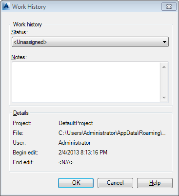You can also enter status and notes in the Work History dialog box, if your project administrator has configured the dialog to display when you open or close a drawing. Note that this is not a mechanism for storing, retrieving, or controlling versions of a drawing.