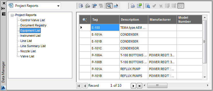 The Data Manager tree displays the report types and reports for a current project. The data view displays fields in the report.