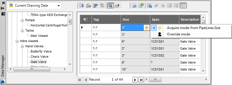 - In the tree view, click a node whose data table contains read-only or acquisition data. View the data in the columns with a gray background.