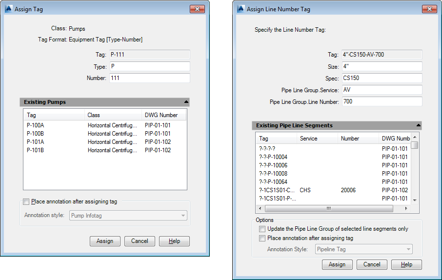Each class contains different types of tag fields. The dialog box for Pipe Line Segments, for example, has the fields Tag, Size, Spec, PipeLineGroup.Service, and PipeLineGroup.LineNumber.
