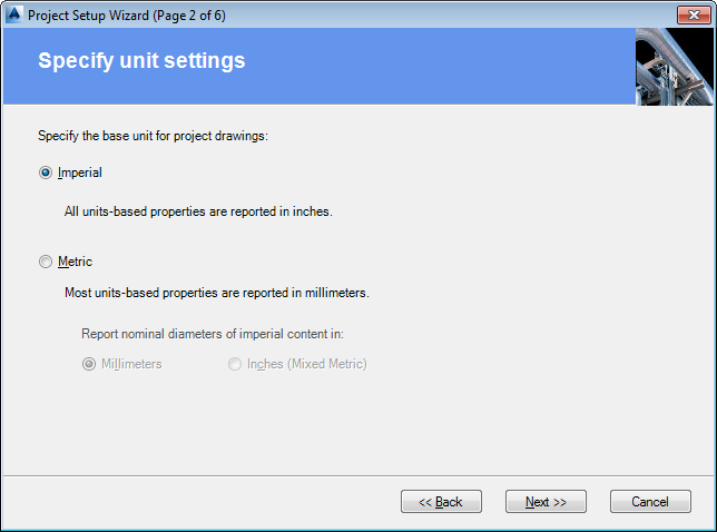 - In the Project Setup Wizard (Page 2 of 6), specify whether the project is imperial or metric. If you chose metric, specify the units for nominal diameters when the content is imperial. Click Next.