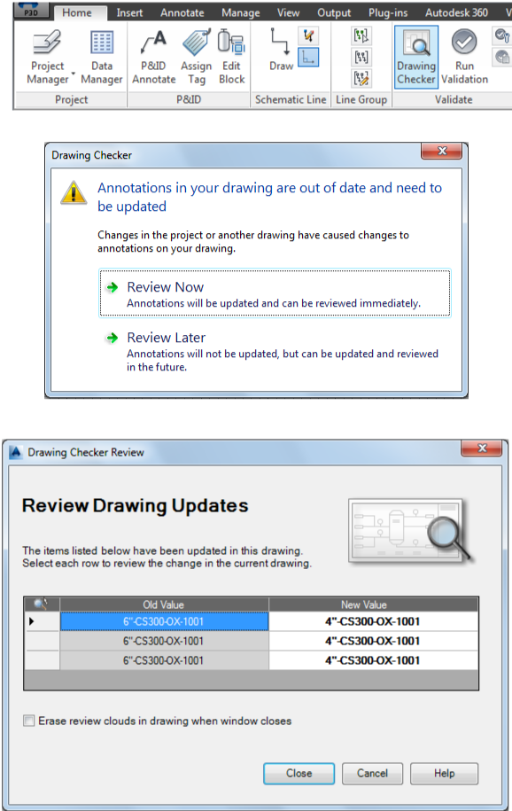 The Drawing Checker examines all text and annotations in the P&ID against the current project properties to find discrepancies caused by recent changes made outside of the drawing. It identifies updates for the current drawing.