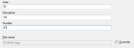- Specifies the new file name. If the original file name was created using a file-name format, for example, a format that combined Area, Discipline and number separated by a - delimiter, the Rename DWG dialog box would have these fields: