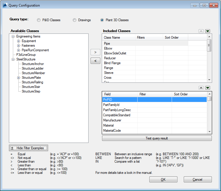 - For Query Type, click P&ID Classes, Drawings, or Plant 3D Classes.