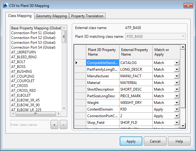 Specifies whether you want to match the properties or apply a specific property value. For example, for the AutoPLANT AT_BOLT class, the Plant 3D Length property is set to match AutoPLANT Bolt_len. But the Plant 3D PartCategory property is set to the specific value Fasteners.