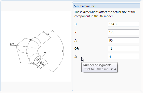 Some parameters can be set to calculate from other parameters. For example: an elbow bend radius (R) value of zero indicates the bend is set to half the diameter (D / 2.0).