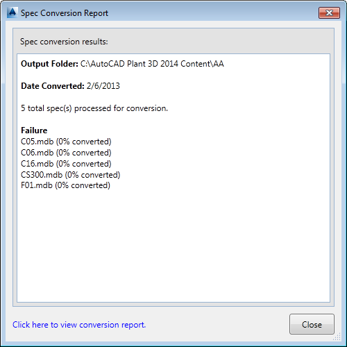 Lists the conversion results for specs or catalogs migrated from AutoPLANT to Plant 3D format.