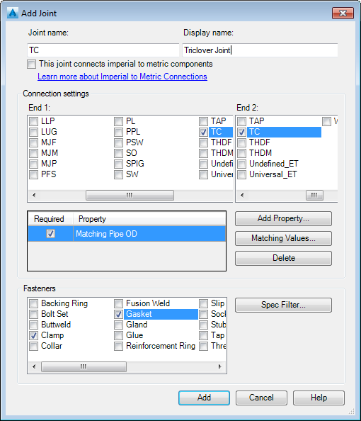 Joint types that support imperial to metric connections are distinct from same-unit joint types. This allows you to specify matching properties such as 150#, 10PN.