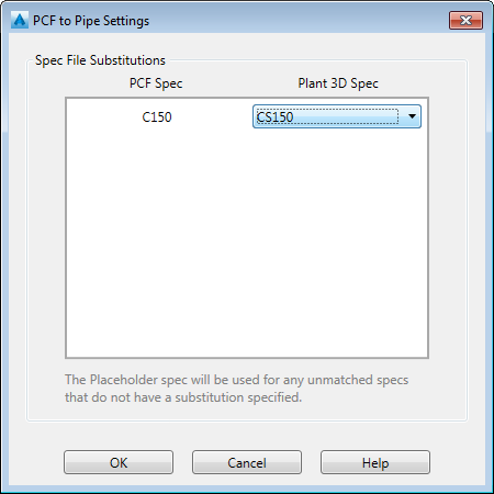 In cases where the current project spec files do not match the PCF, you can designate a Plant 3D pipe spec to substitute.