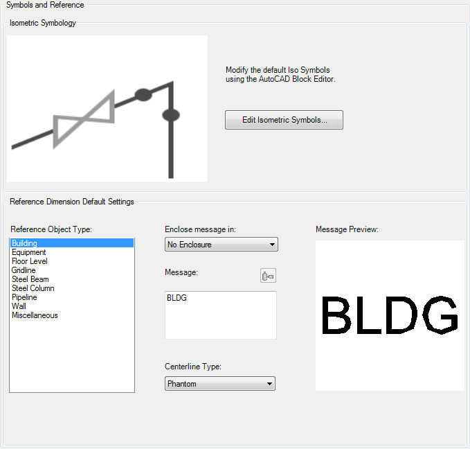 Lists Plant objects. When an Iso reference dimension is created in the 3D model to the object, the defaults assigned here are applied.