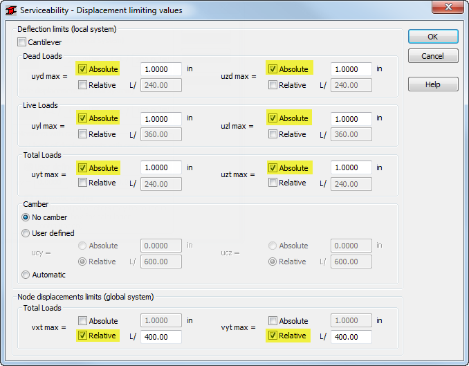 In the Deflection limits (local system) group of options, select the Absolute value for Dead, Live and Total Loads,