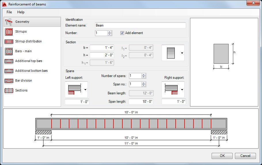 After the beam geometry is defined, specify values of dimensions for the beam-cross-section and spans.