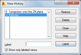 Views that result from zooming, translation, rotation, projection onto different planes, and the visualization of such structure attributes as: supports, sections, loads, and so on, are added consecutively to the list in the dialog and assigned successive numbers. To name a view, enter a label and click Label. The new name is added to the list of views. To return to the previous structure view, double click the view or select the view from the list and click Restore.