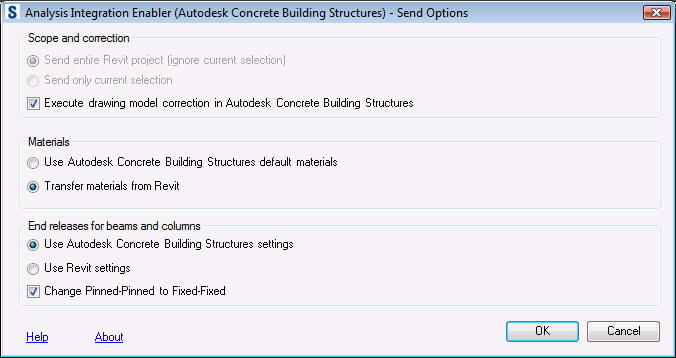 - In the Analysis Integration Enabler (Autodesk Concrete Building Structures) - Send Options dialog, specify the transfer options: