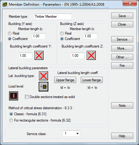 The Lateral Buckling Parameters field allows selecting options used during verification of lateral buckling of the member: lateral buckling type, load level and lateral buckling length coefficient. Pressing the relevant icon opens the dialog box for definition of appropriate parameters.