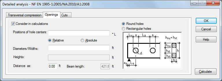 The options provided on this tab are intended for verification of shear strength of a beam with holes. The verification is carried out for all holes defined by the user. The program reads automatically values of transversal forces acting at points where holes are positioned for a decisive load case. Before starting the calculations, it is checked whether defined holes are geometrically correct and if an error occurs, the relevant warning appears.