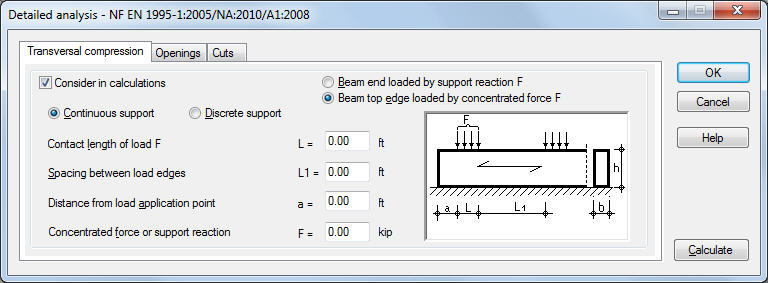 The options provided on this tab are used to verify the strength for compression perpendicular to the grain of a beam subjected to action of a compressive force F applied to the top or bottom edge of a beam.