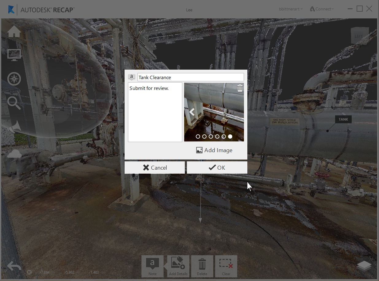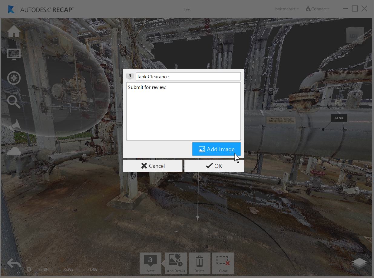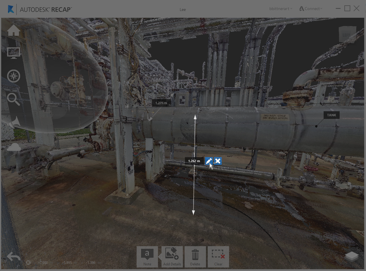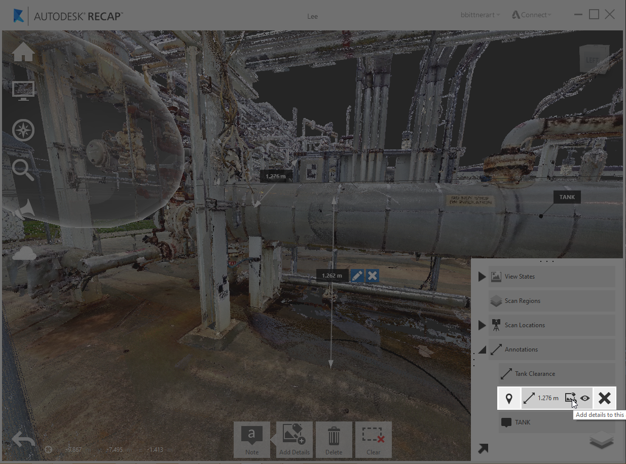Any annotation (measurements or markups) created within ReCap 360 or Recap 360 Ultimate can now have notes assigned directly to them allowing for a richer form of communication. Title and description text, along with image attachments, can be added to markups at any point by selecting the "edit" tool either on the in-canvas object: