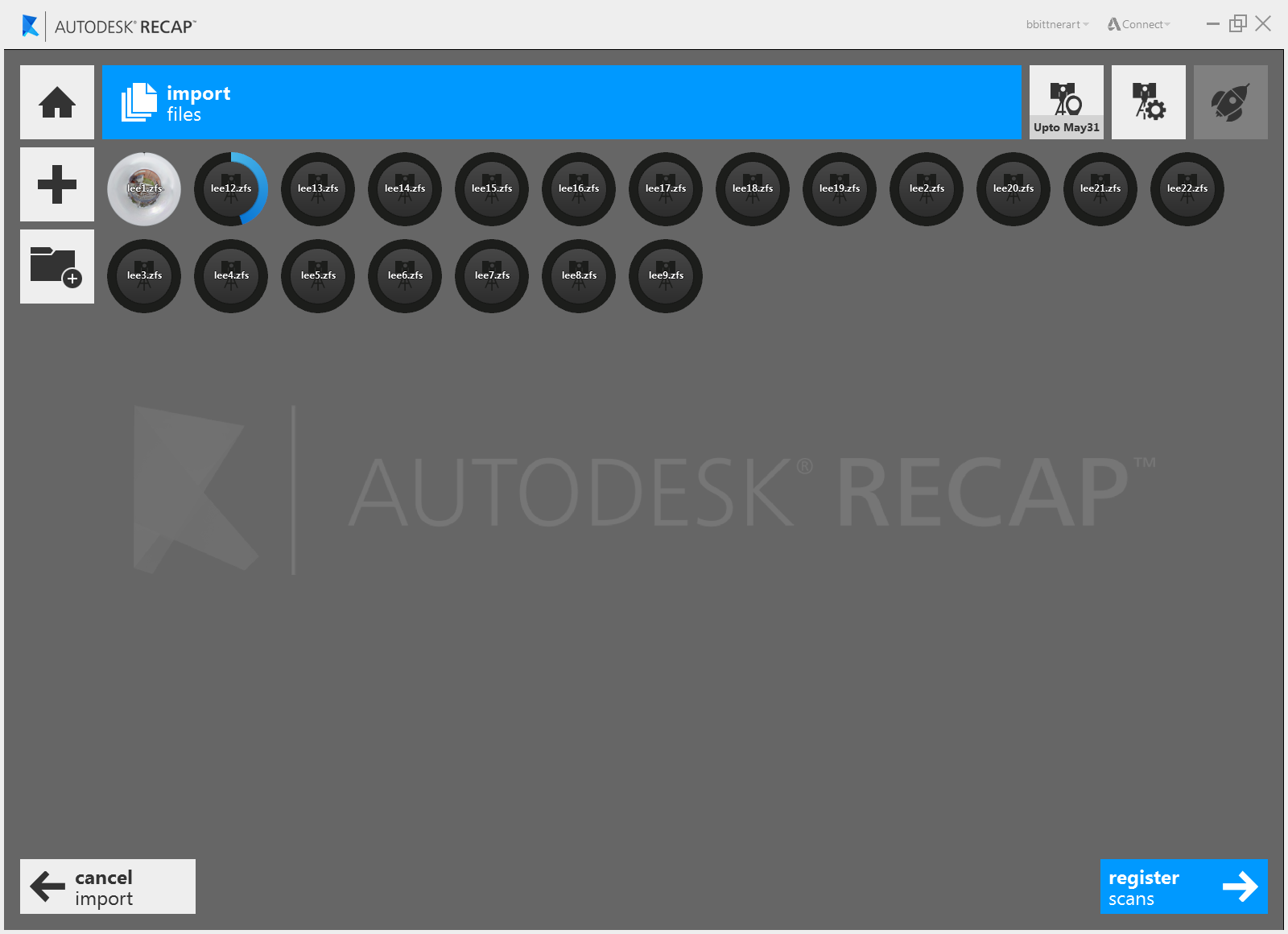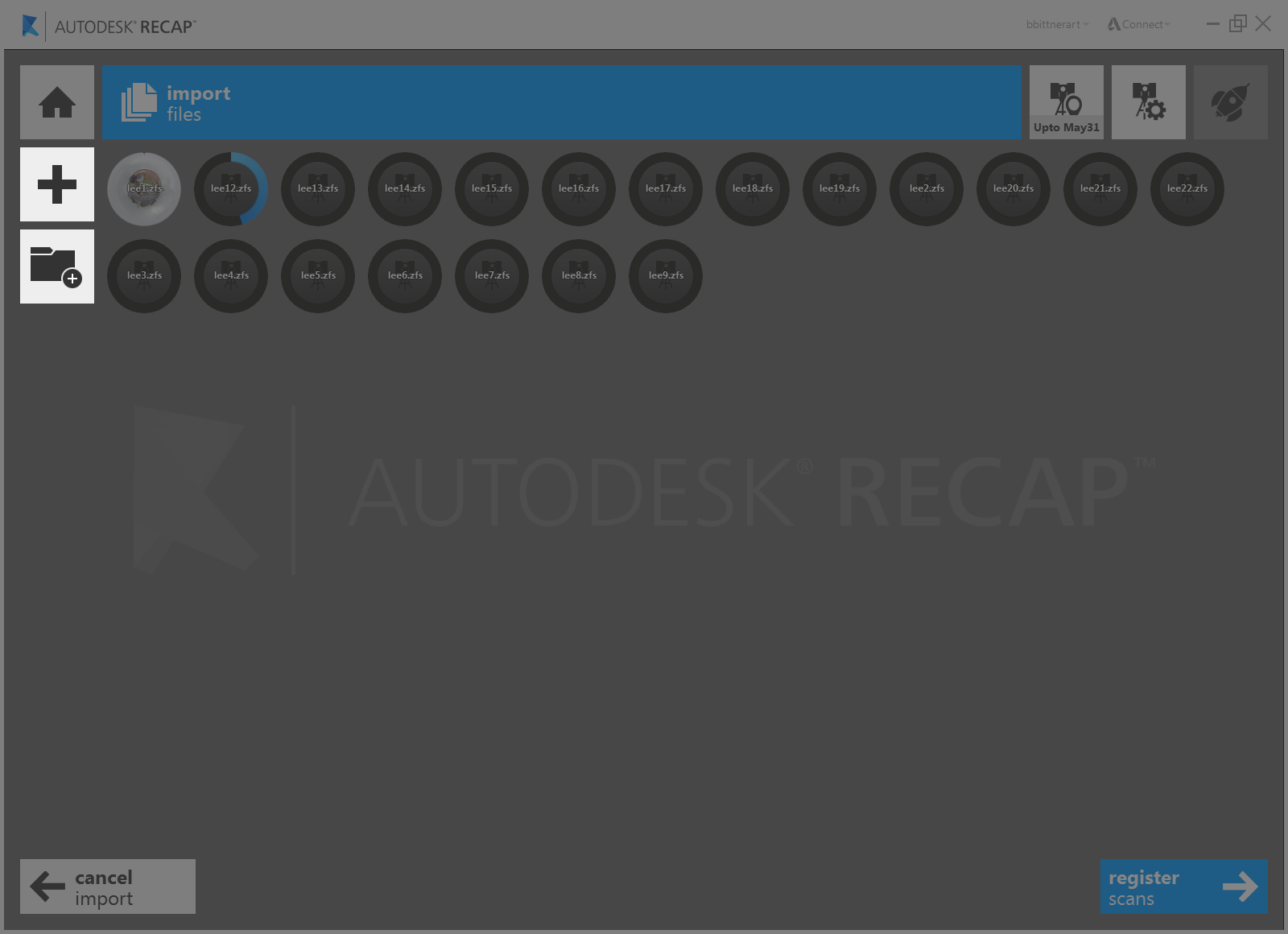 Once you've begun adding files the import process will begin automatically. All files must be imported before automatic registration begins. Manual registration is available as soon as the first scan has been imported. This may take a few minutes depending on number of scans and density of their data. You can see import progress through each scan's individual progress bar:
